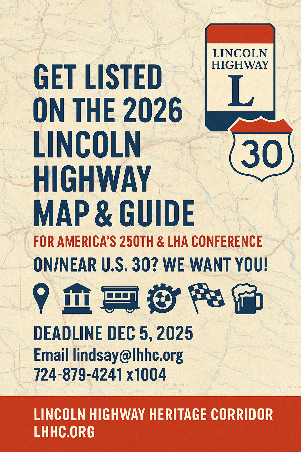 In 2026, the Lincoln Highway Heritage Corridor will release a printed & digital map highlighting must-see stops along our 200-mile stretch of America’s first coast-to-coast highway—timed for America250 and the Lincoln Highway Association National Conference in York, PA. The map will be distributed at our museum, visitor centers, events, and partner locations, and available online for trip planning.